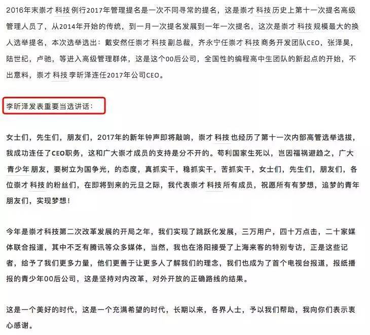 如果從產(chǎn)品、業(yè)務(wù)的角度來衡量崇才科技還不算一家成功的公司話,從品牌、公關(guān)的角度來看,李昕澤這么小的年紀(jì),能做到如此境界,已經(jīng)秒殺了不少公關(guān)公司。