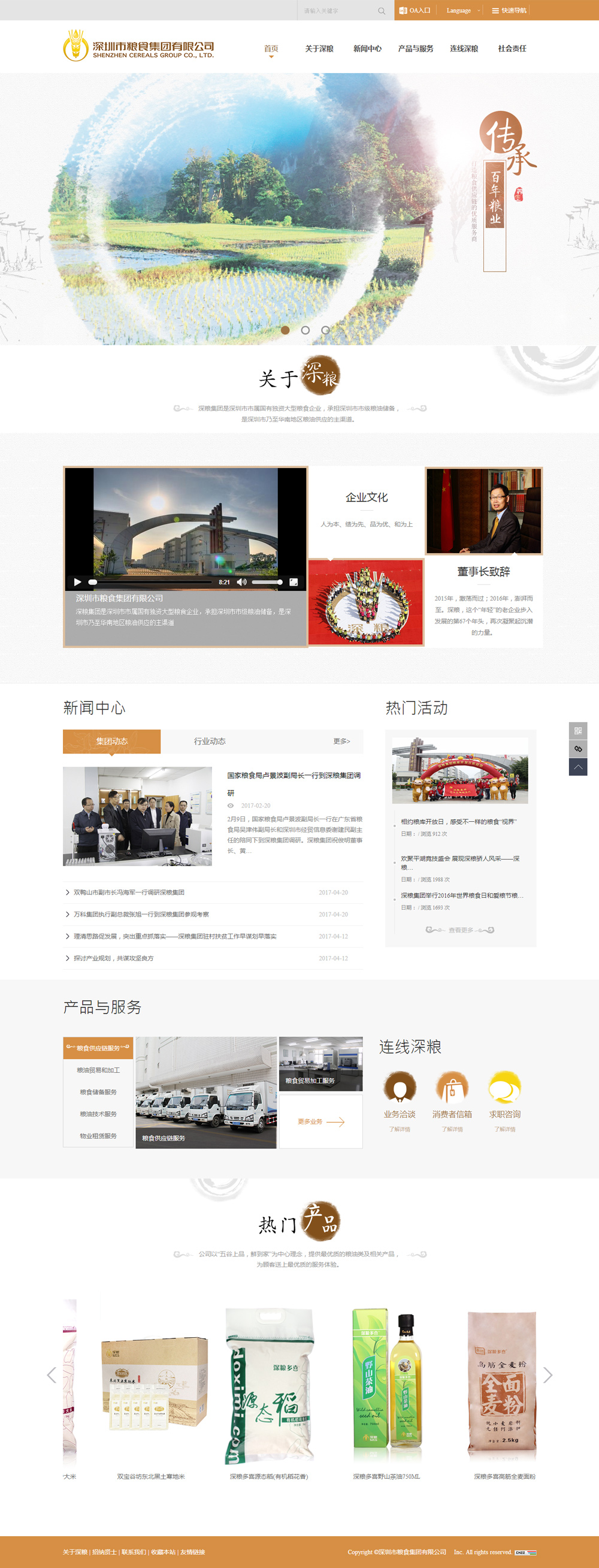 深糧集團(tuán)是深圳市市屬國有獨(dú)資大型糧食企業(yè),是深圳市的“米袋子”,受政府委托,承擔(dān)我市市級地方糧食儲備,同時(shí)負(fù)責(zé)駐港、駐深部隊(duì)的軍糧供應(yīng)任務(wù)。深糧集團(tuán)前身是寶安縣糧食局,深圳特區(qū)成立后沿革為深圳市糧食局。1982年實(shí)行政企分開,改為企業(yè)建制。1984年率先在全國進(jìn)行糧食流通體制改革。1998年經(jīng)公司制改造,更名為深圳市糧食集團(tuán)有限公司。集團(tuán)成功創(chuàng)立了“深糧多喜”、“多喜米”、“谷之香”、“君子蘭”、“紅荔”等品牌,被深圳市政府授予“放心糧油”稱號,年糧食購銷量130萬噸,約占深圳口糧市場份額的33%。