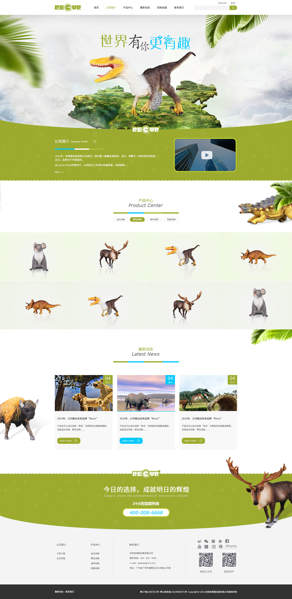 2014年,公司推出自有品牌“Recur”,產(chǎn)品主打以遠古動物“恐龍”為原型的仿真靜態(tài)模型,包括遠古動物、野生動物、海洋動物、農(nóng)場動物等幾大系列,產(chǎn)品設計的理念“品質(zhì)、安全、愛心自然、快樂”,力求通過仿真模型“近距離的接觸”,培養(yǎng)兒童對自然生命的認知,從小對地球生態(tài)、環(huán)境的重視,同在一片藍天下,與自然界其它生命體和諧共處方能生生不息,這也是我們品牌的核心價值!